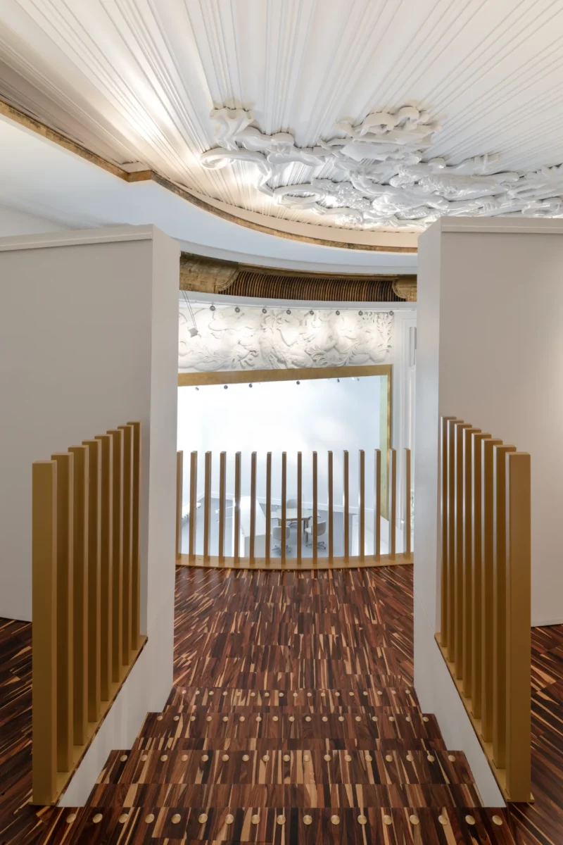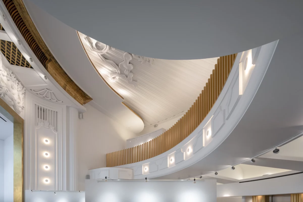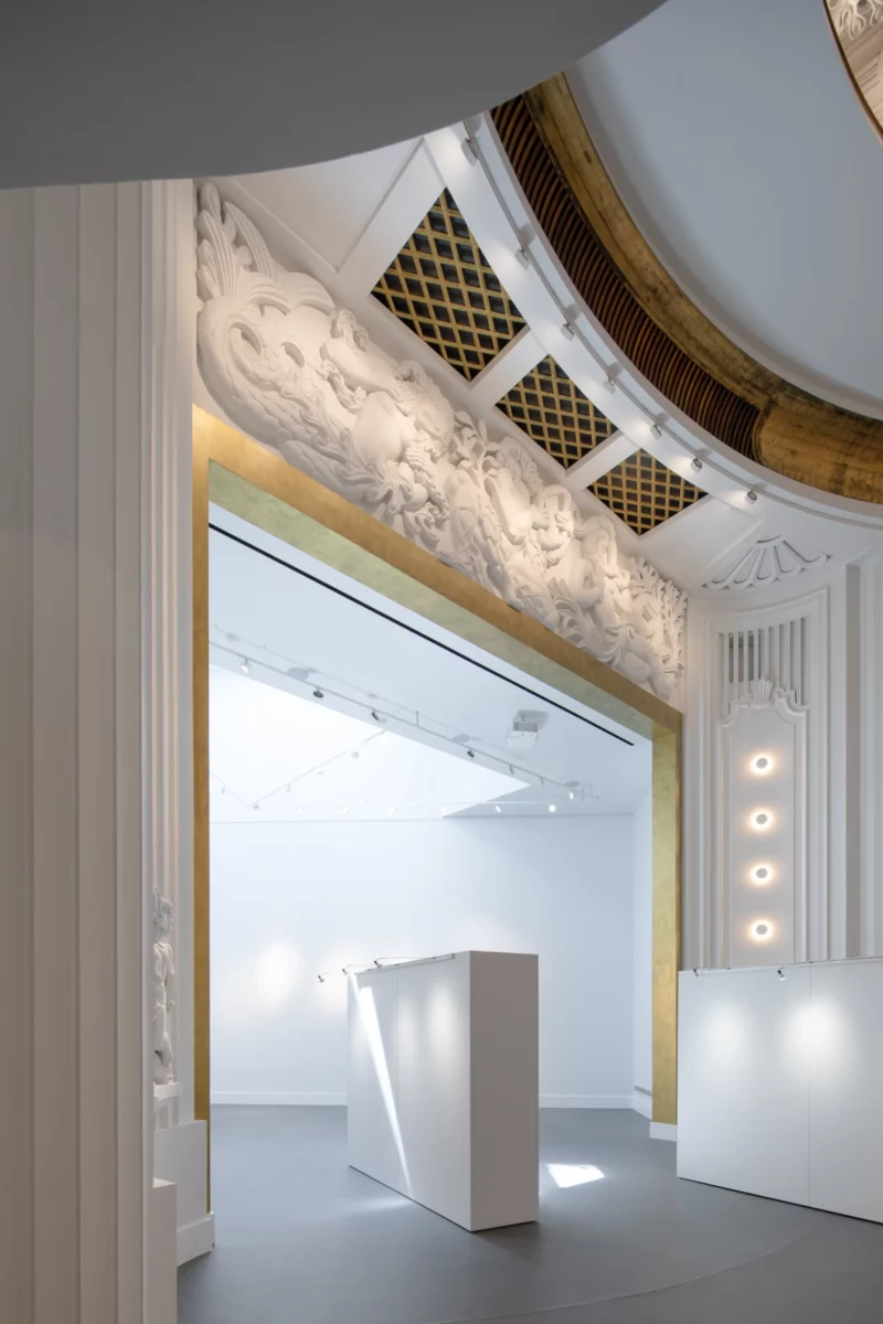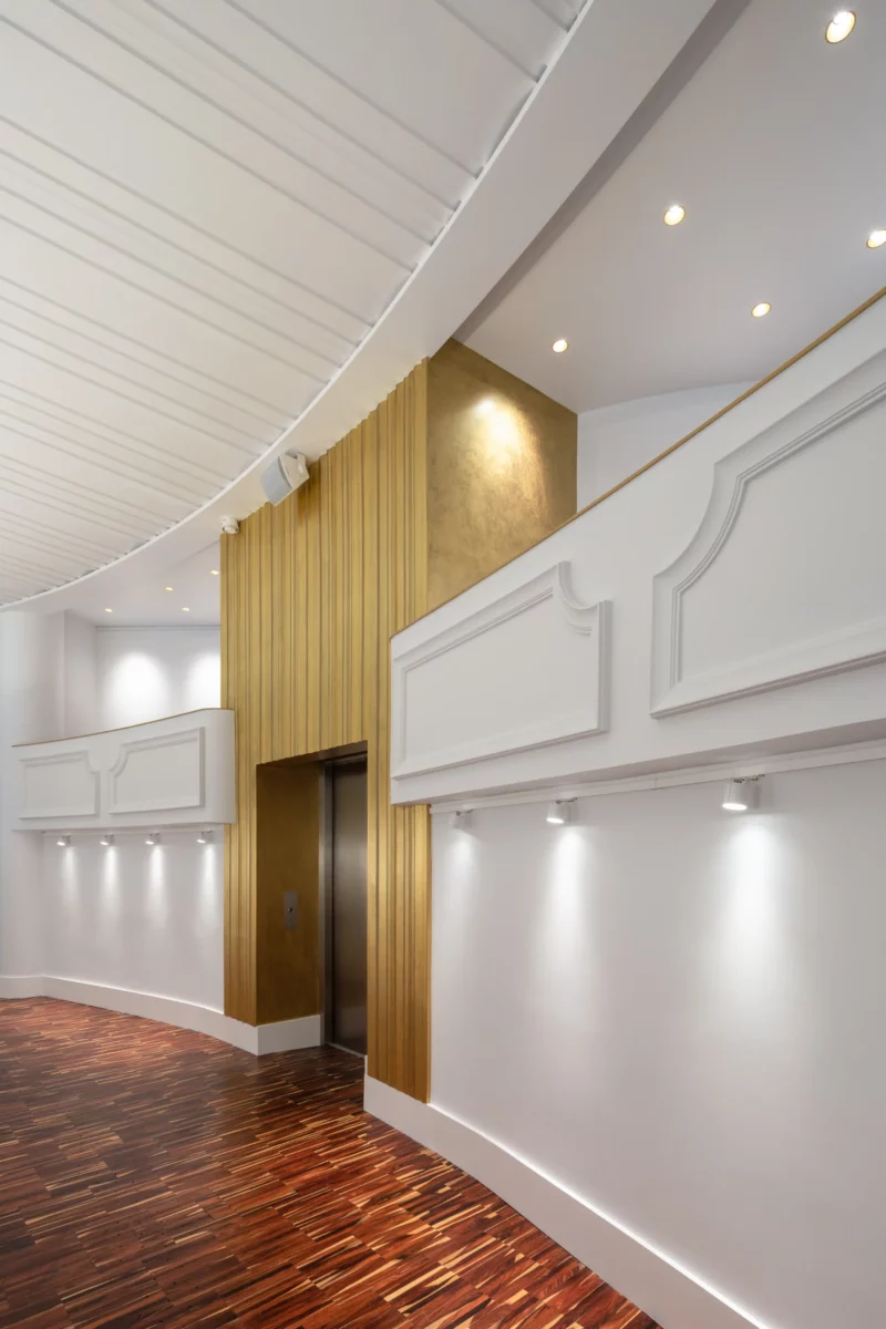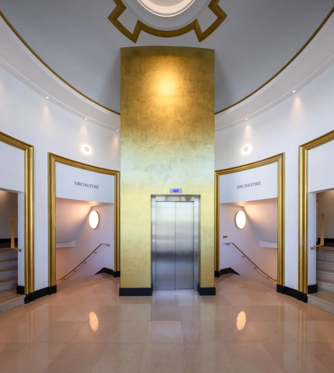 Le Comoedia, lieu mythique et emblématique de Brest est une œuvre de l’architecte Michel Ouchacoff qui s’inscrit dans le patrimoine de la reconstruction. Transformer ce lieu magique en centre d’art contemporain, c’est finalement poursuivre une évolution continue d’un lieu dédié à la culture, propre à capter l’air du temps, et propice à la confusion des genres inhérent au monde de l’art. Nous nous sommes donc rapidement accordés sur une démarche volontaire et une évolution radicale mais respectueuse de l’architecture d’origine ; Le nouvel aménagement dépasse le conservatisme pour concilier le patrimoine, la création architecturale et l’art contemporain, et offrir un nouveau lieu d’expression plastique, moderne, inventif et durable. La distribution d’origine répondait parfaitement à la nouvelle fonctionnalité du lieu, qui respecte les espaces majeurs des halls haut et bas, du balcon, du parterre et de l’espace scénique existant. L’ensemble s’organise selon un carré parfait sur la diagonale, et qui génère en coupe, un espace semi enterré quasiment aveugle. Pour s’adapter, le parterre est mis à plat, la scène et la fosse d’orchestre sont supprimés .Le balcon est modifié pour recevoir un nouveau gradinage structuré par des cimaises courbes ; une nouvelle scénographie, qui offre un linéaire d’exposition et permet déambulation et contemplation au-dessus du vide majestueux de la salle. La rénovation intègre avec discrétion et efficacité les éléments techniques nécessaires au confort : ascenseur, organes de sécurité, traitement d’air ; Un espace technique invisible a été créé dans le vide de l’ancienne cage de scène ; Dans ce nouvel écrin tout en intériorité et en nuance, un soin particulier a été porté la lumière pour créer une ambiance lumineuse très contemporaine, et mettre en valeur la richesse du décor et plus particulièrement le plafond en staff, orné des Neptune du sculpteur Jean René Debarre.